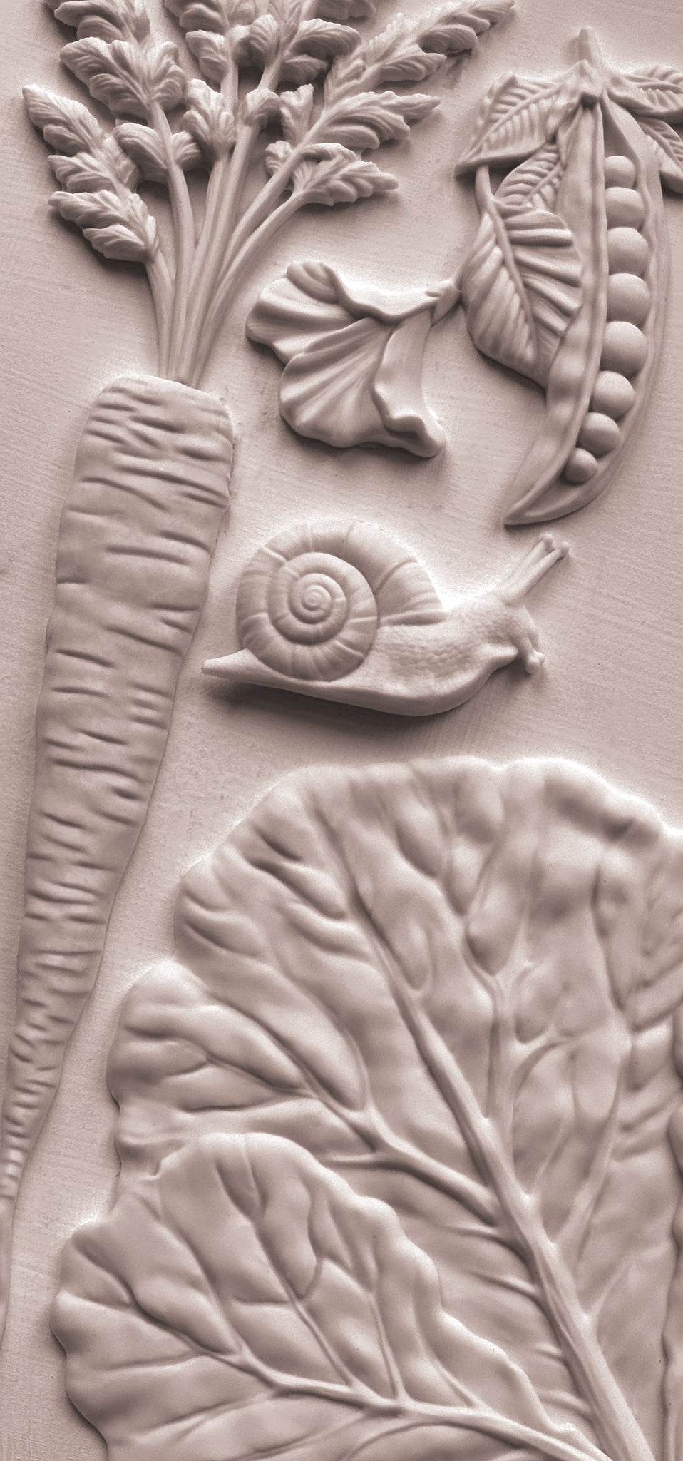 The 6x10” Spring Garden Mould is inspired by classic cabbage-leaf crockery, complete with the intentional veining that makes those pieces so beautiful in glaze or paint. The cabbage leaf was the starting point for this set, and with extra space in the mould, we added some favorite spring garden vegetables—plus a little snail companion (just for funsies!).